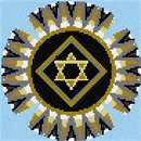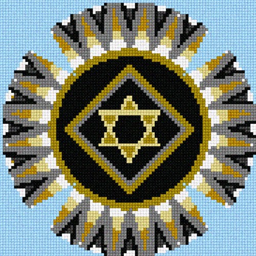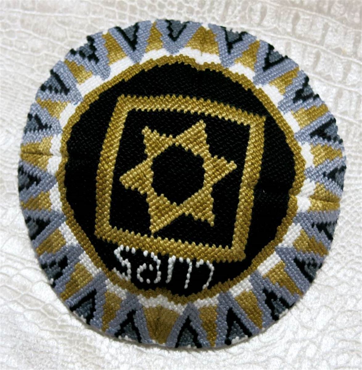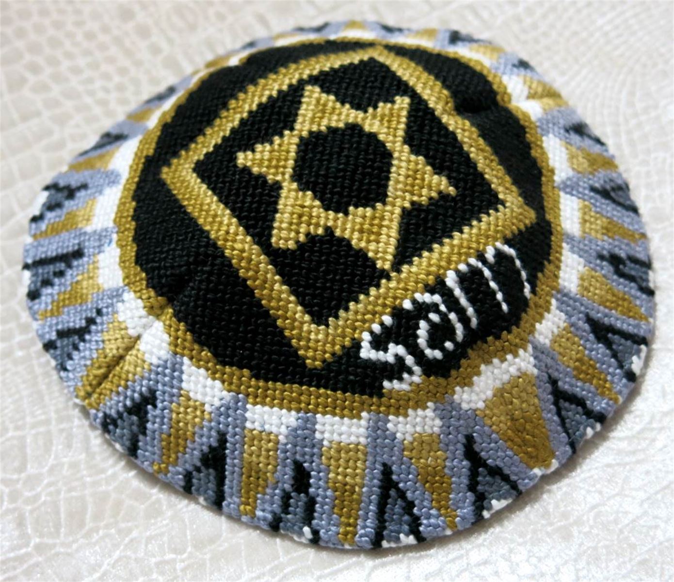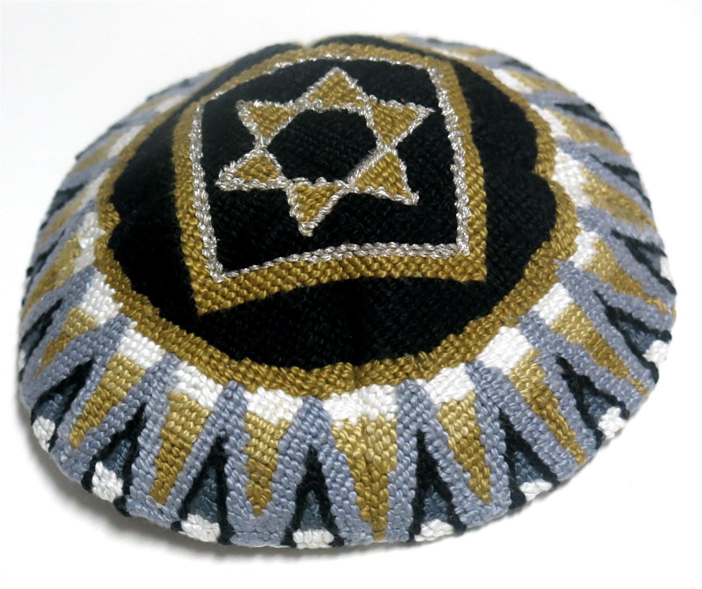 Angles and segments bring together blacks, coppers and whites. A kippah is a brimless cap, usually made of cloth, traditionally worn by Jewish males to fulfill the customary requirement that the head be covered. It is worn by men in Orthodox communities at all times.